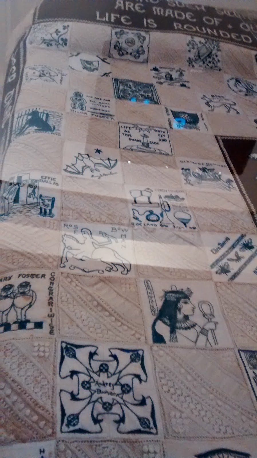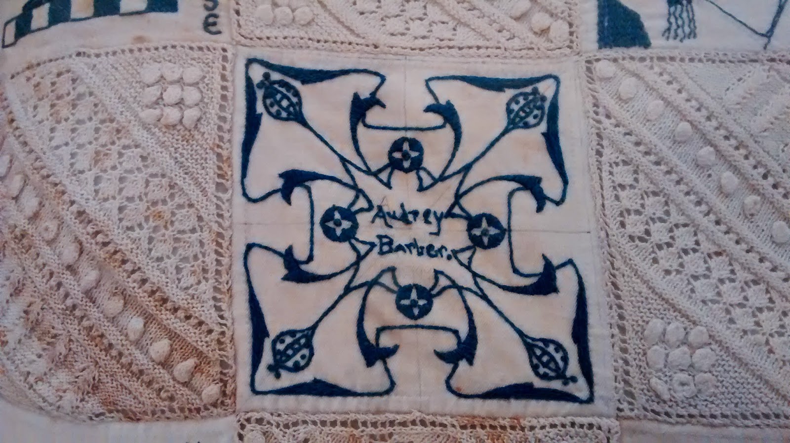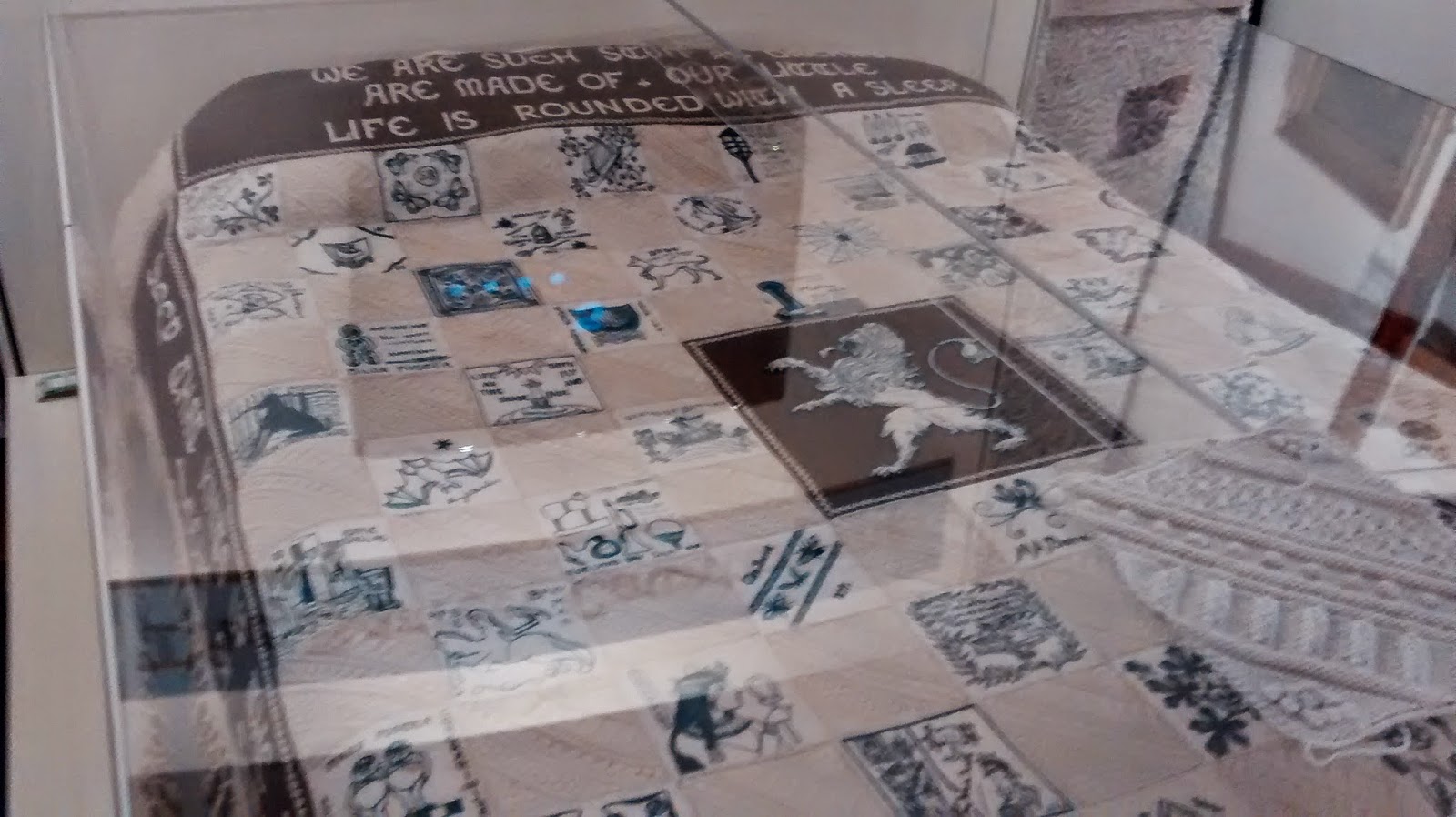Britannia bed quilt at the Quaker tapestry exhibition in Kendal, more details about the quilt here. It is 100 years old and combines embroidery and knitting. It was amazing.