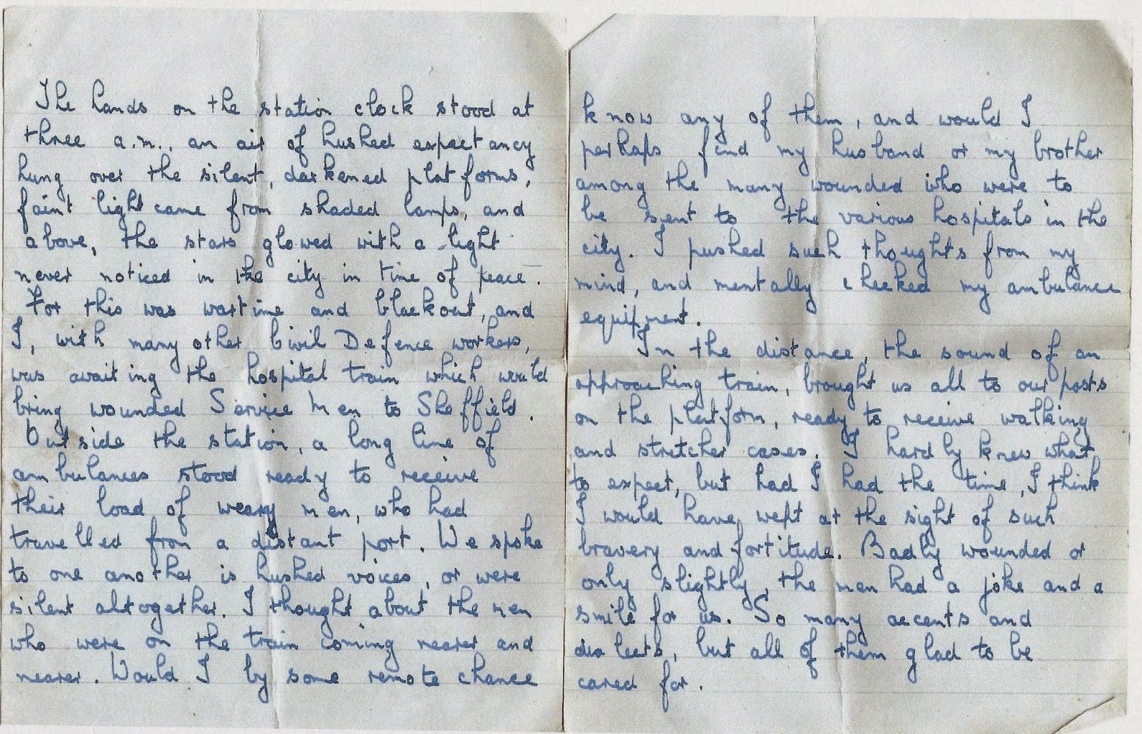 “The hands of the clock stood at 3am, an air of hushed expectancy hung over the silent, darkened platforms, faint light came from shaded lamps, and above, the stars glowed with a light never noticed in the city in a time of peace.  For this was wartime and blackout, and I, with many other Civil defence workers was awaiting the hospital train which would bring wounded Service Men to Sheffield.